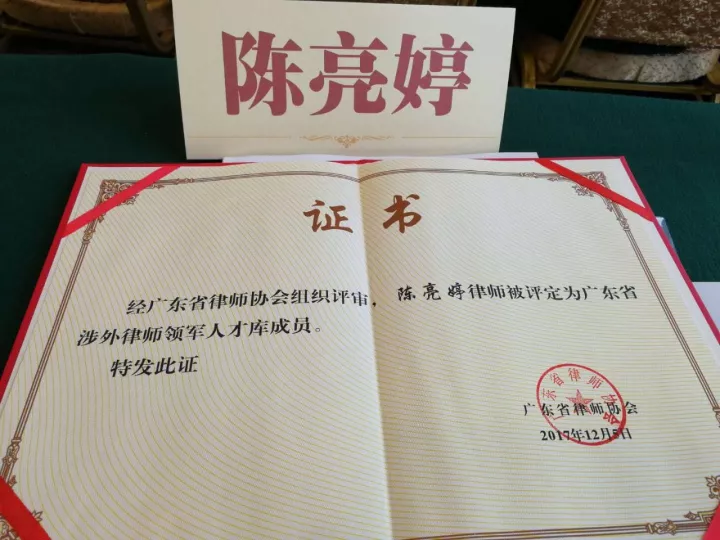 近日,省律师协会从全省约3.6万名律师中,经过申报、考试、评审等严格程序,选拔出135名律师组成“广东省涉外律师领军人才库”,以期提高广东律师涉外法律服务水平,更好服务国家“一带一路”建设。本所优秀青年律师陈亮婷,凭借良好的英语和近五年内已承办理30个以上涉外案件的丰富经验,成功免试入选。